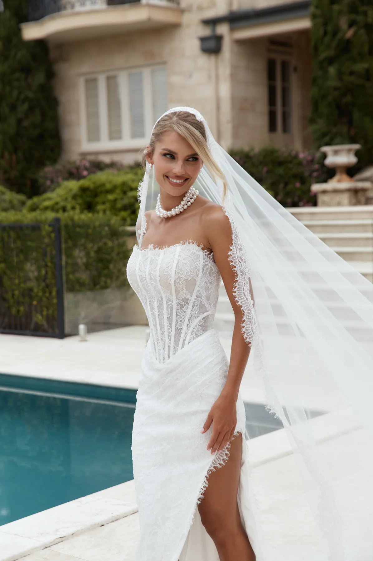 The CLAREMONT VEIL, a final touch to any bridal look. Crafted from an airy tulle, and finished with our signature Claremont lace trim, a scalloped edge, with soft eyelash detailing, it frames the silhouette with effortless elegance ā designed to elevate any bridal look.Ā