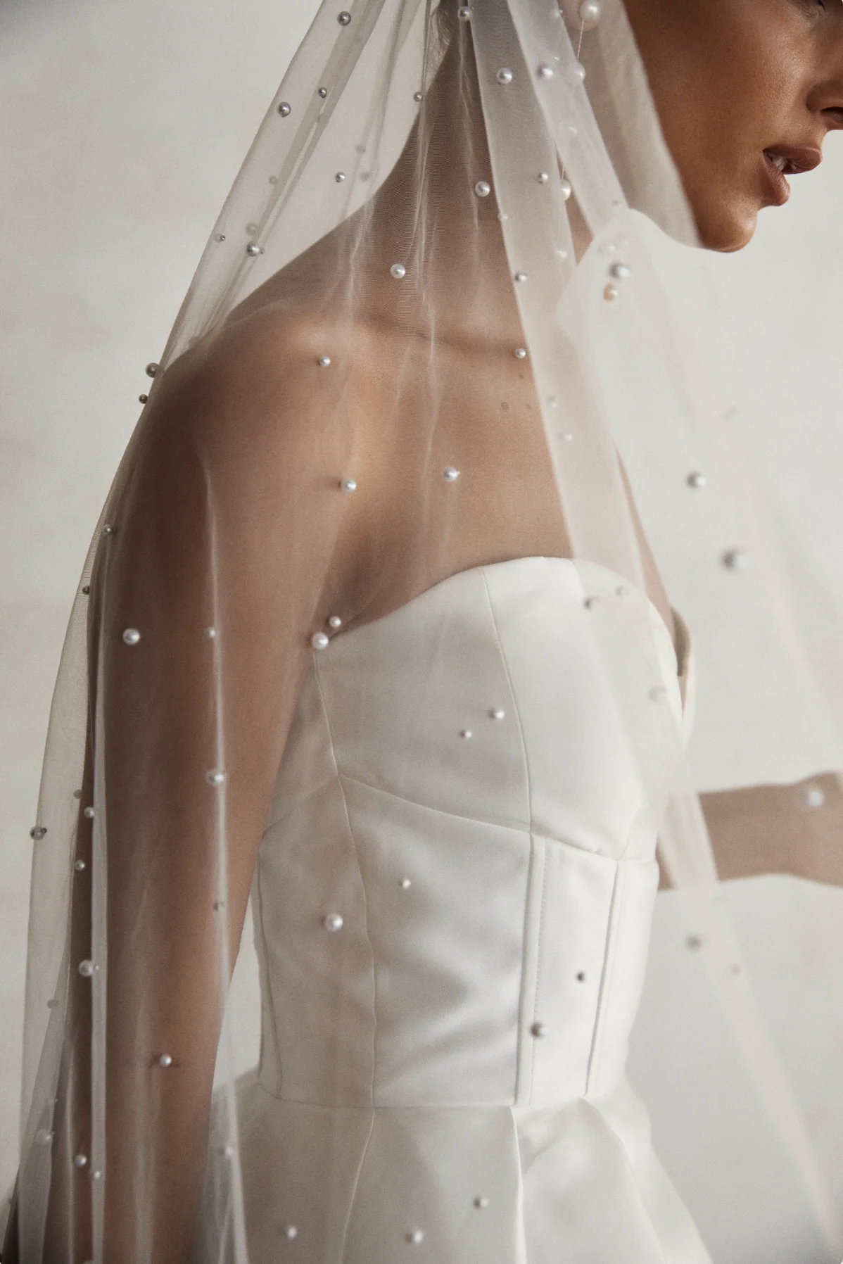 Our international best selling accessory for a reason! A modern classic, reimagined for the statement bride. Our PEARL CATHEDRAL VEIL is delicately scattered with a multitude of pearls, from crown to hem, creating a subtle, luminous shimmer with every step. Truly an unforgettable moment.Ā